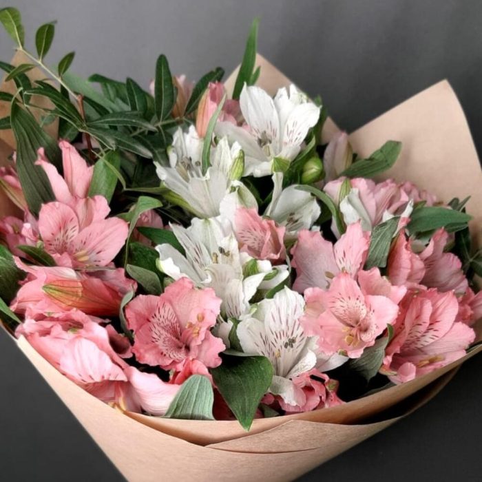 Альстромерия Микс Европа – 9 шт.Крафт упаковка – 3 шт.Лента атласная – 1 шт.зелень декоративная – 3 шт.