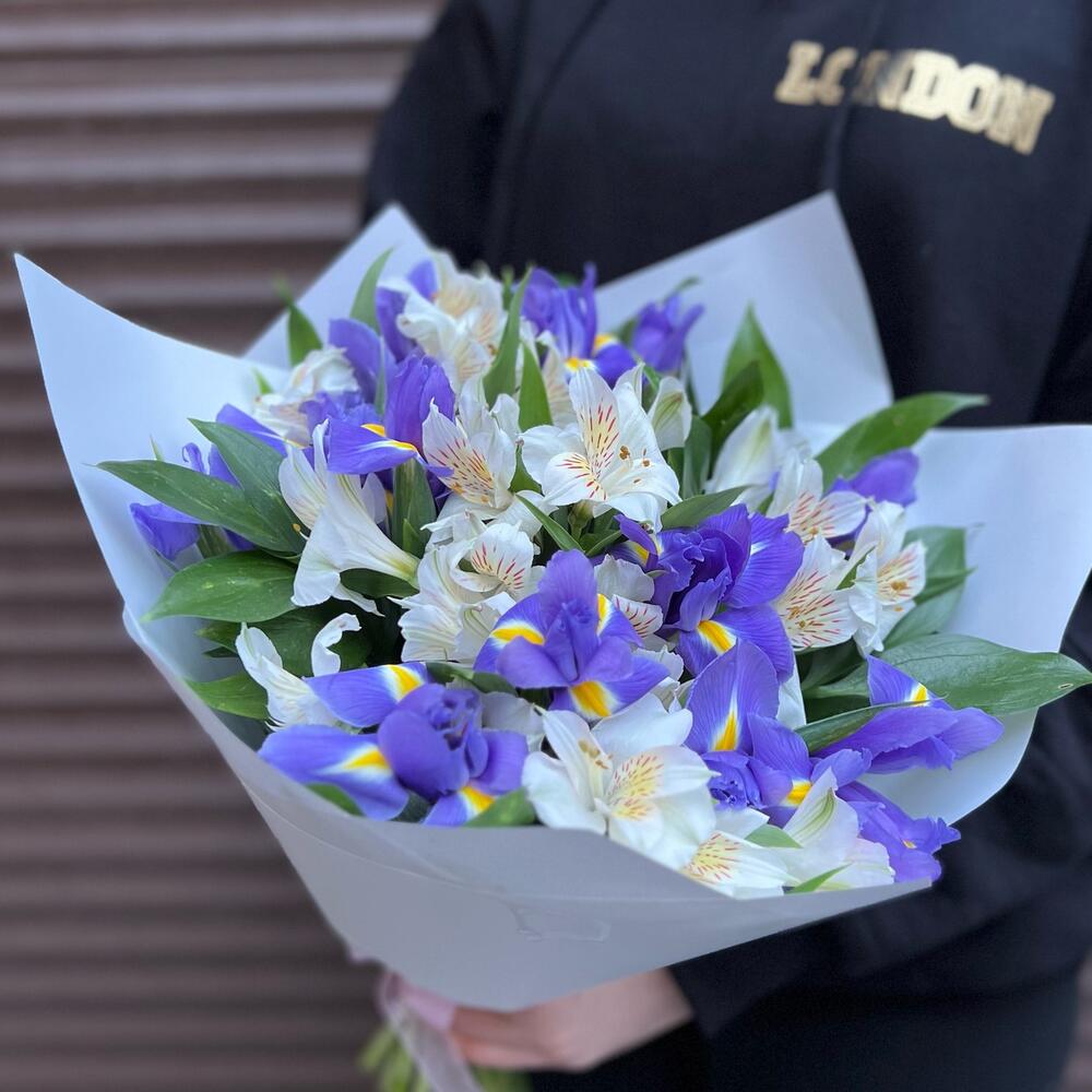 Альстромерия – 7 шт.Ирис – 12 шт.Корейская пленка – 2 шт.зелнень – 7 шт.