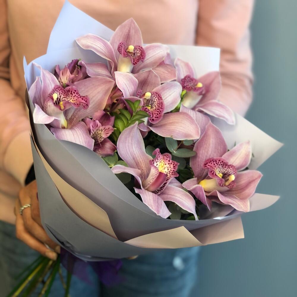 Альстромерия – 2 шт.Орхидея Цимбидиум – 7 шт.Самшит – 2 шт.Упаковка дизайнерская – 1 шт.