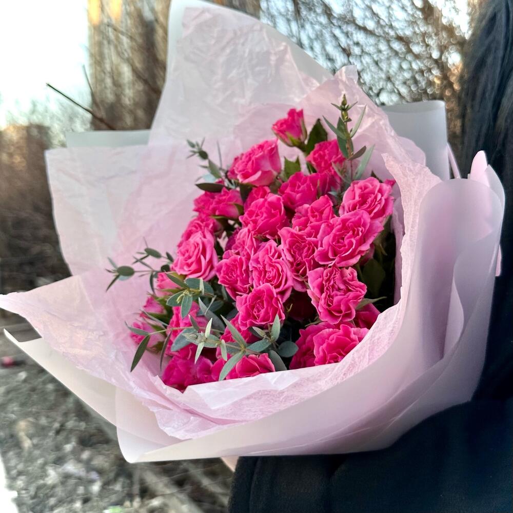 Эвкалипт – 3 шт.Лента атласная – 1 шт.Пленка матовая – 2 шт.Открыточка с вашими пожеланиями – 1 шт.Тишью розовая – 2 шт.