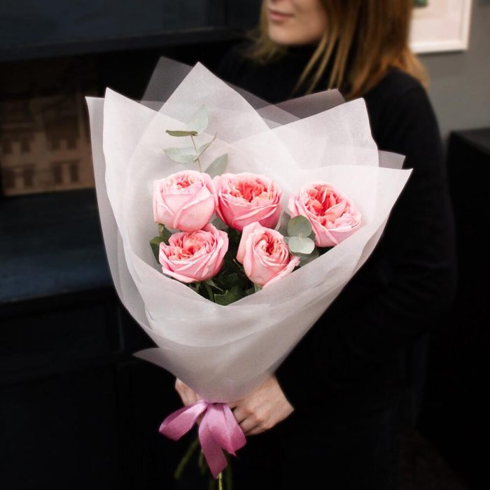 пионовидные розы – 5 шт.Эвкалипт – 1 шт.Матовая пленка – 1 шт.Тишью – 1 шт.Атласная лента – 2 шт.