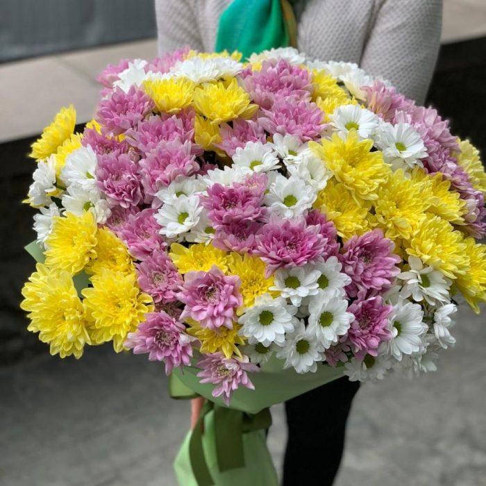 Прекрасный, большой букет из разноцветных хризантем в стильном оформлении.