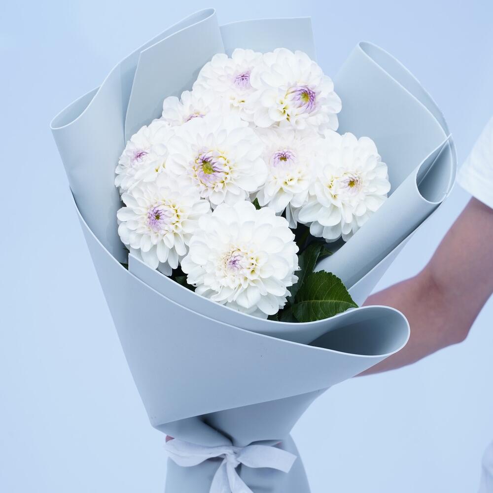 георгины – 9 шт.Лента атласная – 3 шт.Упаковка дизайнерская – 2 шт.хорошее настроение – 100 шт.