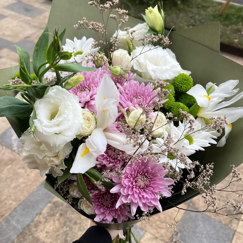 white eustoma – 2 шт. pink chrysanthemum – 2 шт. Green chrysanthemum – 3 шт. white chrysanthemum – 2 шт. spray rose pink – 2 шт. dried limonium – 2 шт.