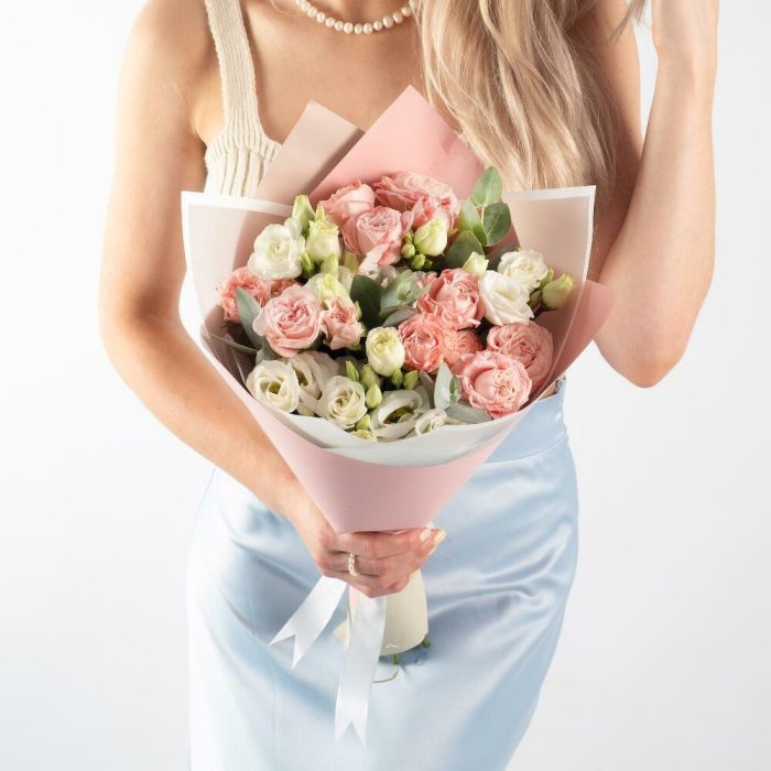 spray peony roses – 3 шт. Eustoma – 2 шт. packaging – 2 шт. gift massage card – 1 шт. care instruction – 1 шт.