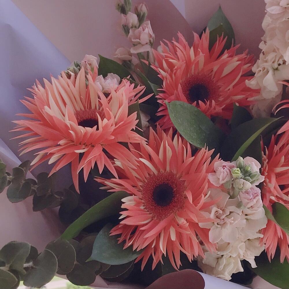 Махровые герберы, маттиола, эвкалипт