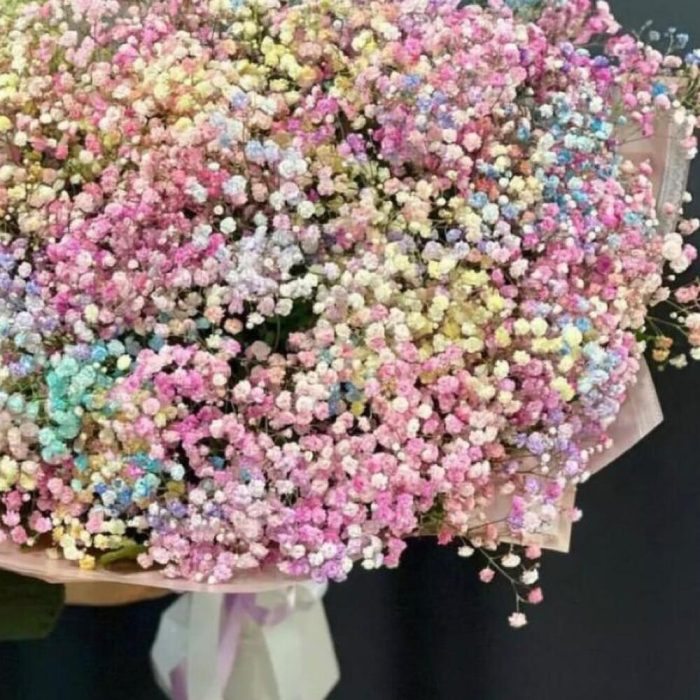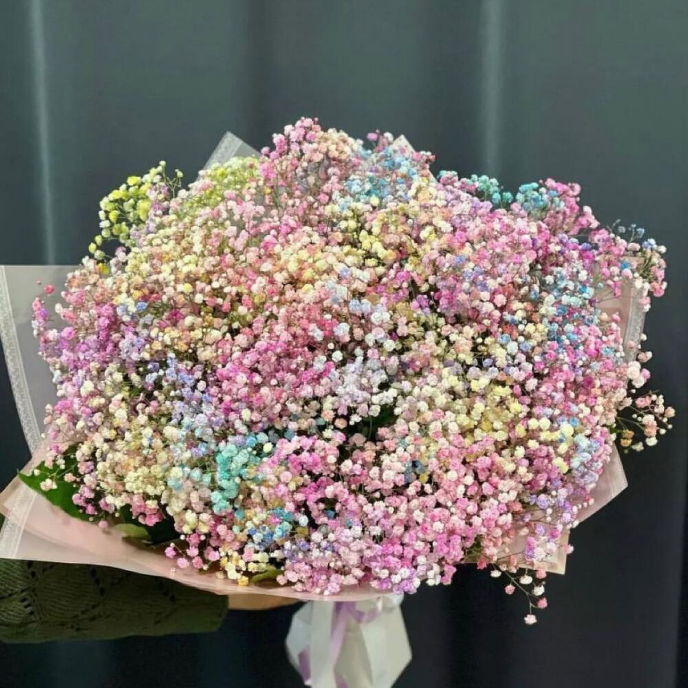 радужная гипсофила – 51 шт.Упаковка дизайнерская – 1 шт.Лента атласная – 2 шт.Открыточка с вашими пожеланиями – 1 шт.хорошее настроение – 100 шт.инструкция по уходу за цветами – 1 шт.коробка переноска – 1 шт.Кризал – 1 шт.