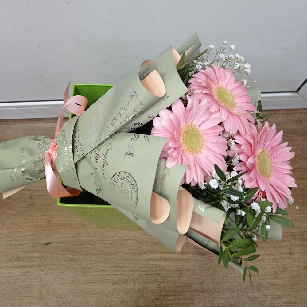 гкрбера – 3 шт.Гипсофила – 1 шт.Фисташка пучок – 1 шт.Упаковка дизайнерская – 1 шт.