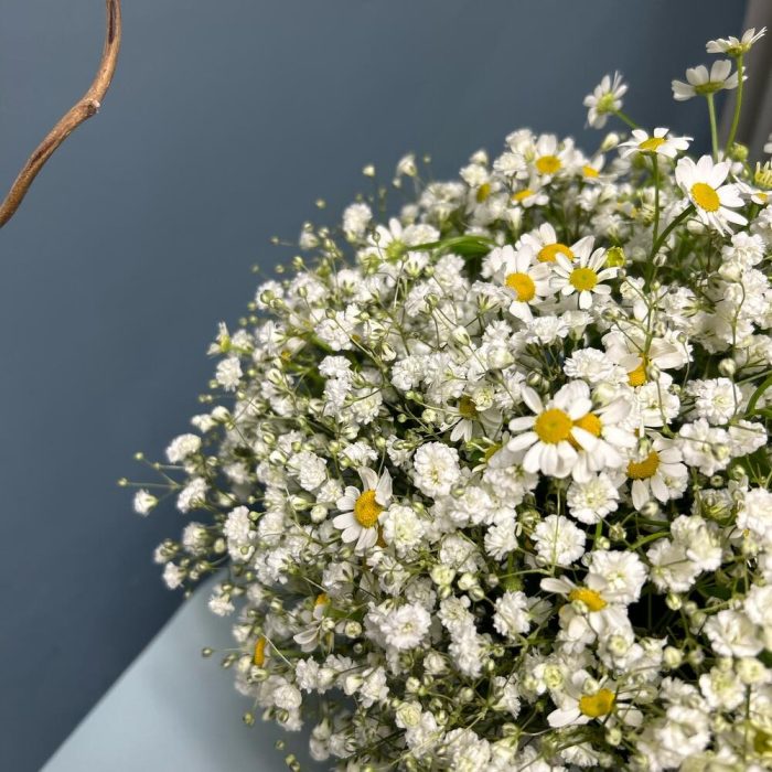 Матрикария – 3 шт.Гипсофила – 5 шт.Коробка шляпная – 1 шт.Оазис флористический – 1 шт.Тишью – 1 шт.