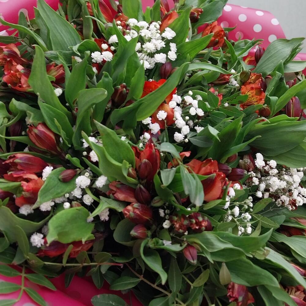 Альстромерия оранжевая – 21 шт.гипсофила белая – 2 шт.Фисташка – 15 шт.Упаковка дизайнерская – 4 шт.