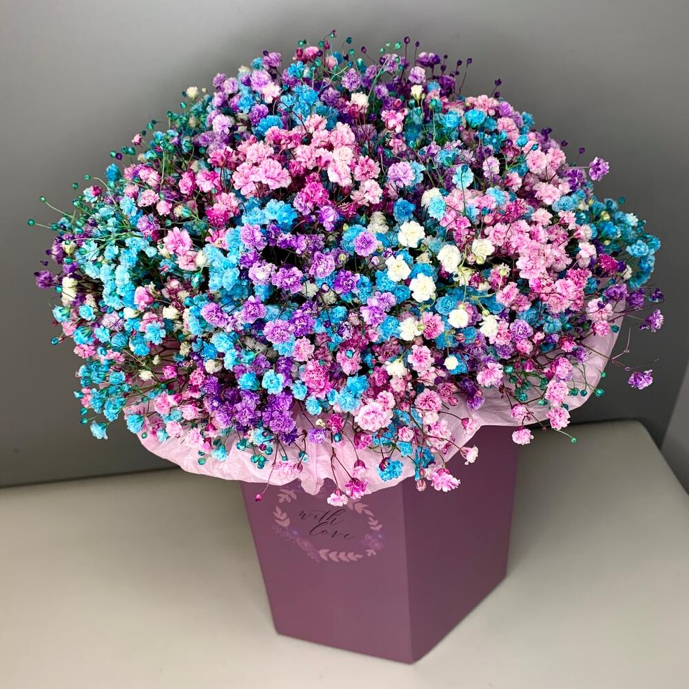 Лента атласная – 2 шт.Тишью – 2 шт.Коробка шляпная – 1 шт.Пленка прозрачная – 1 шт.Оазис флористический – 1 шт.гипсофила радужная – 9 шт.