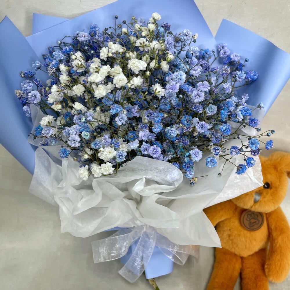 Подарочный набор – Букетик гипсофилы (размеры: 25 см высота, 20 см ширина) с мягкой игрушкой Lapkin. Доставляется в крафтовом пакете (высота 25 см, ширина 22 см, глубина 12 см).