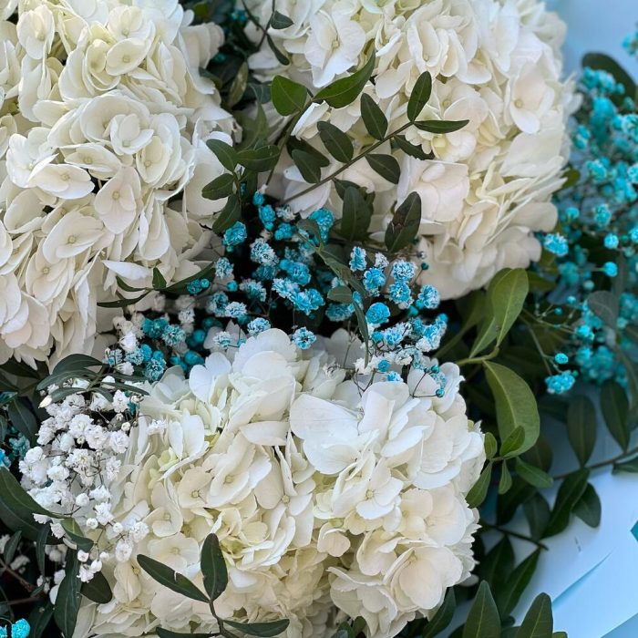 Гортензия – 5 шт. Гипсофила – 5 шт. Фисташка – 10 шт. Упаковка дизайнерская – 8 шт. Лента – 1 шт.