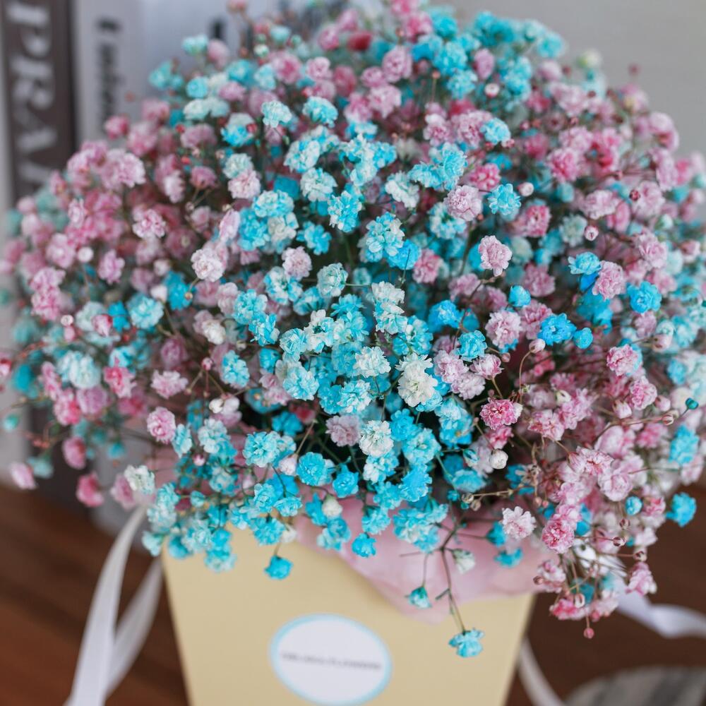 гипсофила цветная – 5 шт.Коробка с лентой – 1 шт.Губка флористическая – 1 шт.Бумага тишью – 1 шт.