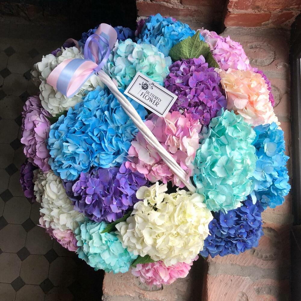 Корзина из 25 огромных гортензий «Летняя мозаика»