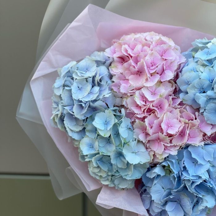 Нежное воздушное облако из микса гортензий Очень объемный букет в воздушной матовой полупрозрачной упаковке