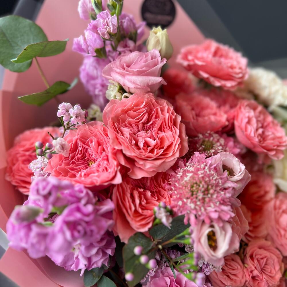 Альстромерия – 1 шт.Лизиантус – 2 шт.Маттиола – 2 шт.Роза кустовая – 6 шт.Скабиоза – 2 шт.Эвкалипт – 2 шт.Роза – 3 шт.Гвоздика – 3 шт.Роза пионовидная – 1 шт.Хамелациум – 2 шт.Атласная лента – 1 шт.декоративная упаковка – 1 шт.