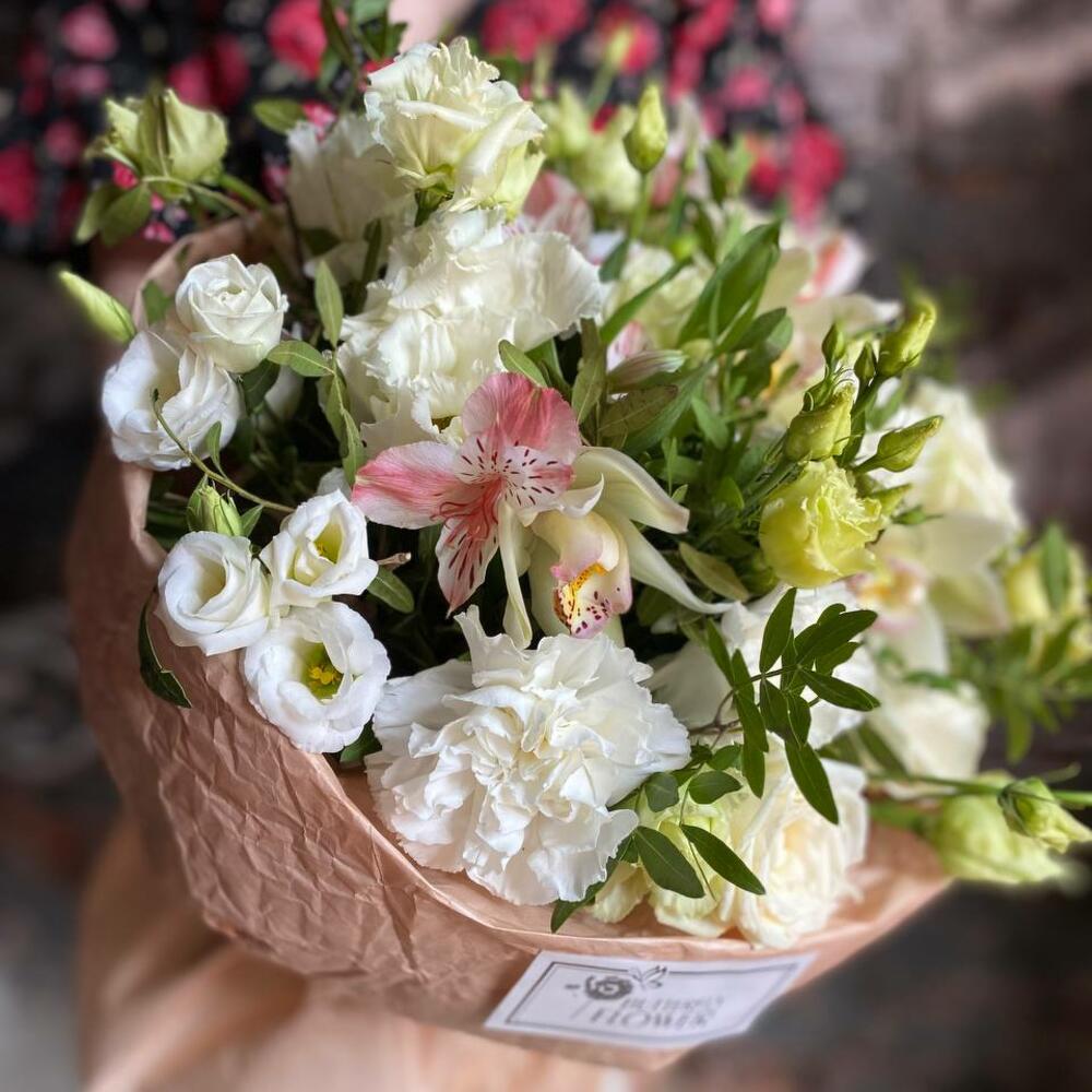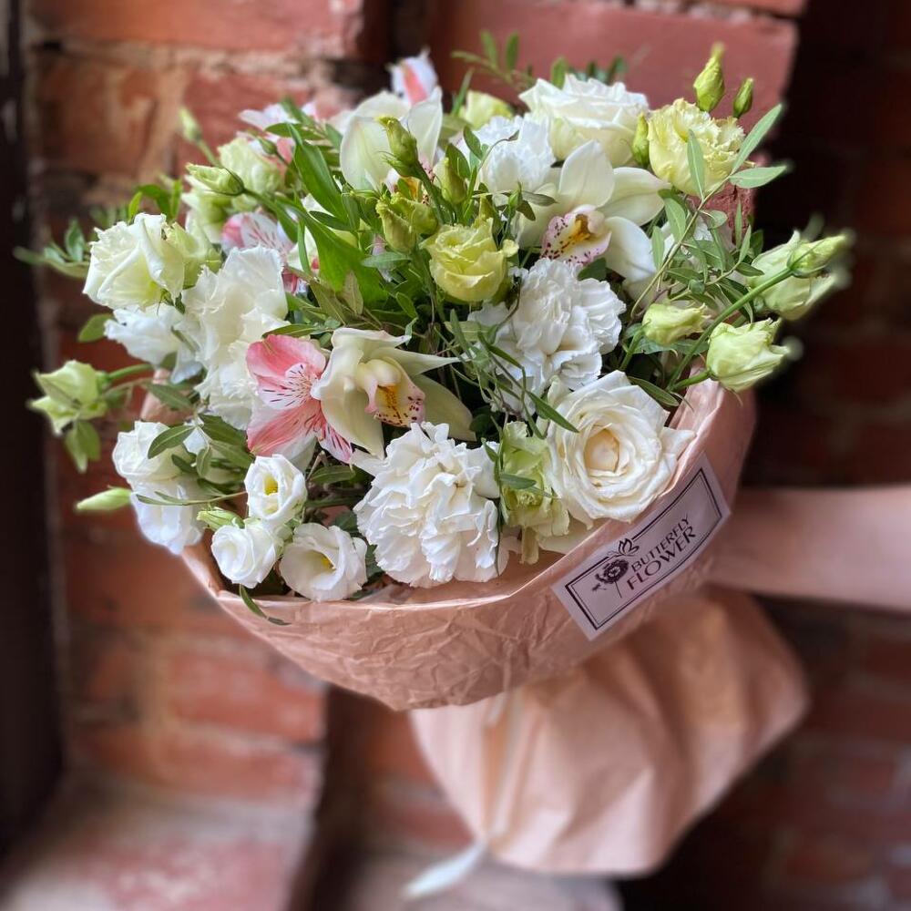 Букет из эустомы, гвоздики, цимбидиума, роз и альстромерии в дизайнерской упаковке “Белая сакура”