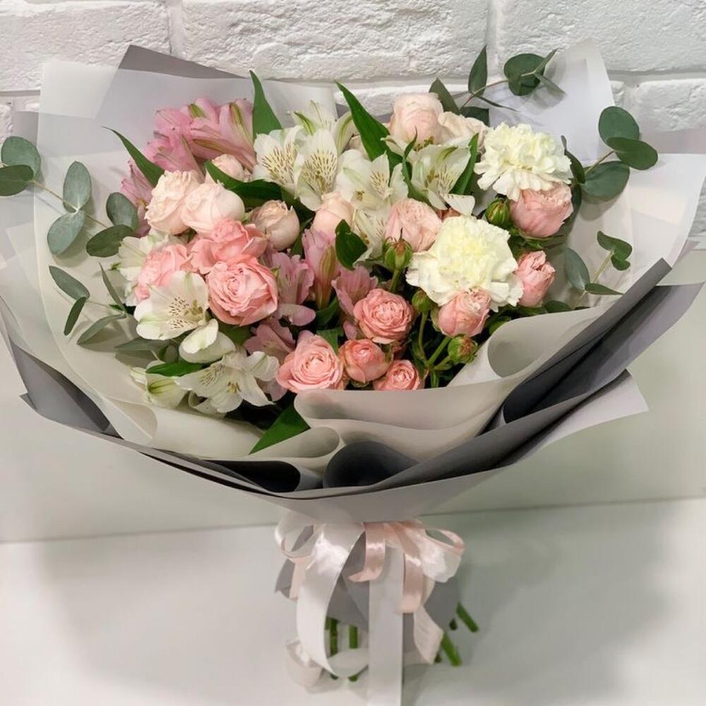 Роза кустовая пионовидная – 7 шт.Альстромерия – 5 шт.Диантус – 3 шт.эвкалипт ценария ветка – 3 шт.Упаковка дизайнерская – 5 шт.Лента атласная – 1 шт.
