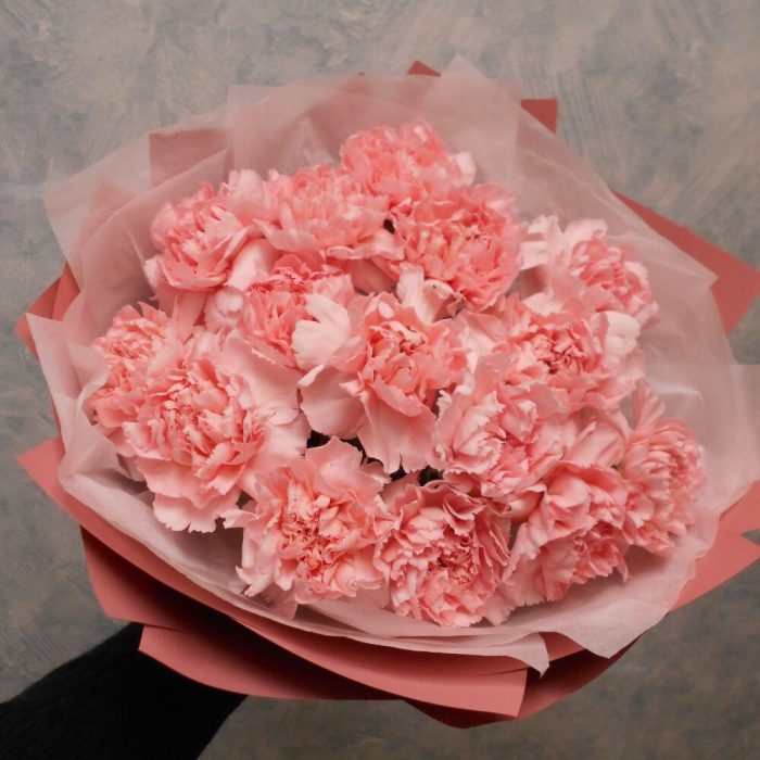 Лента атласная – 6 шт.Пленка матовая – 5 шт.Гвоздика сортовая розовая – 15 шт.Бумага тишью – 4 шт.