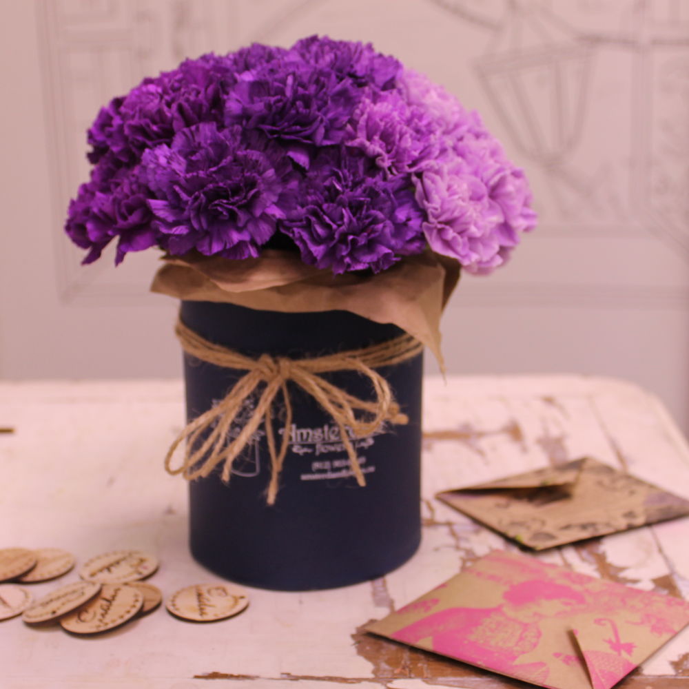 Гвоздика сортовая – 15 шт.Коробка шляпная – 1 шт.Оазис – 1 шт.бечевка – 1 шт.