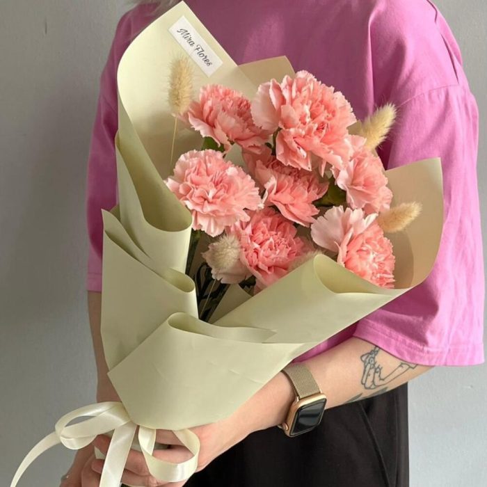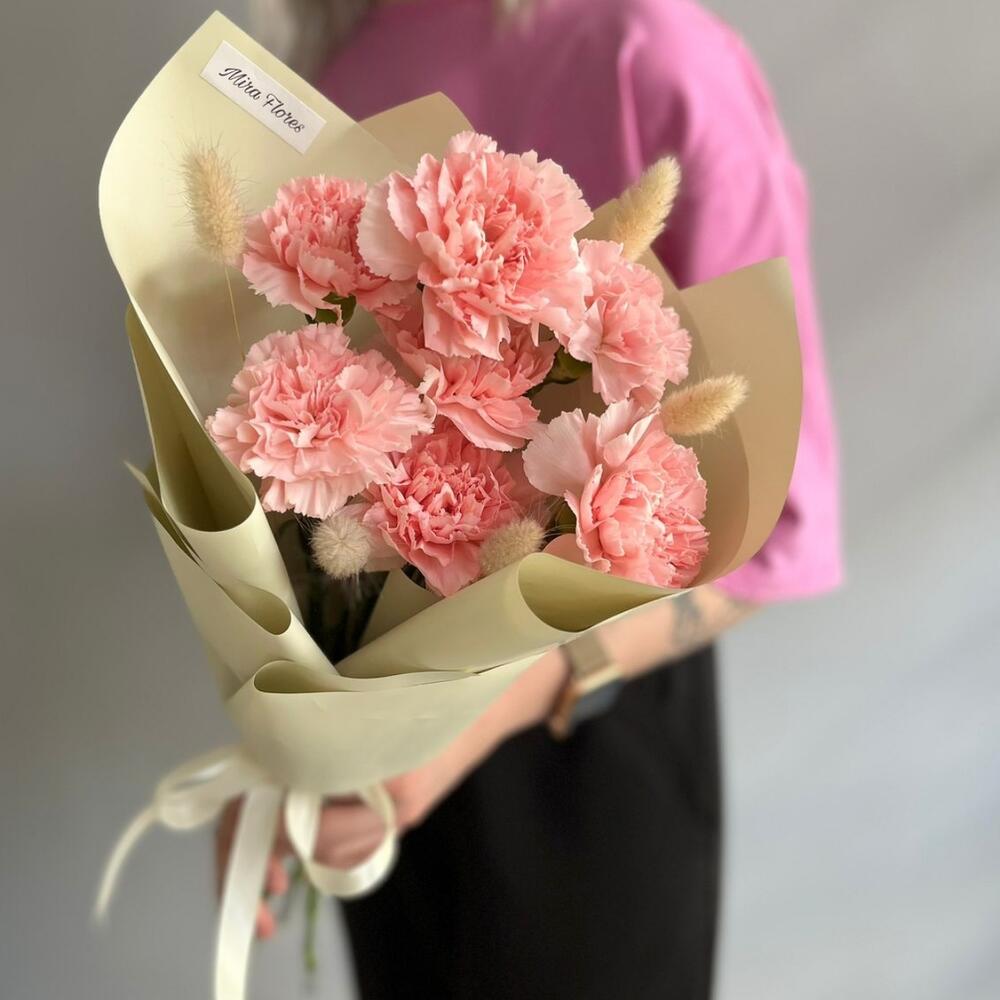 Розовые диантусы (гвоздики) с лагурусом