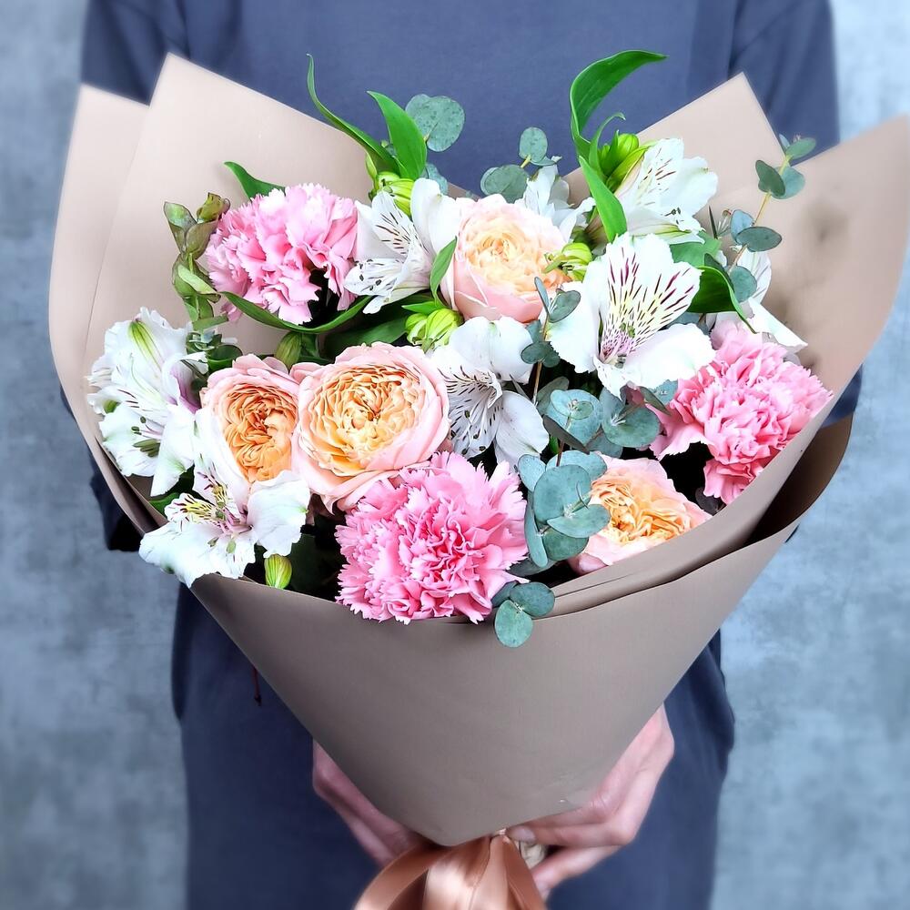 Альстромерия – 3 шт.Эвкалипт – 1 шт.Гвоздика – 3 шт.Роза кустовая пионовидная – 1 шт.Упаковка дизайнерская – 1 шт.