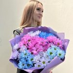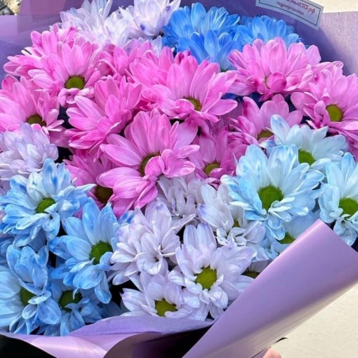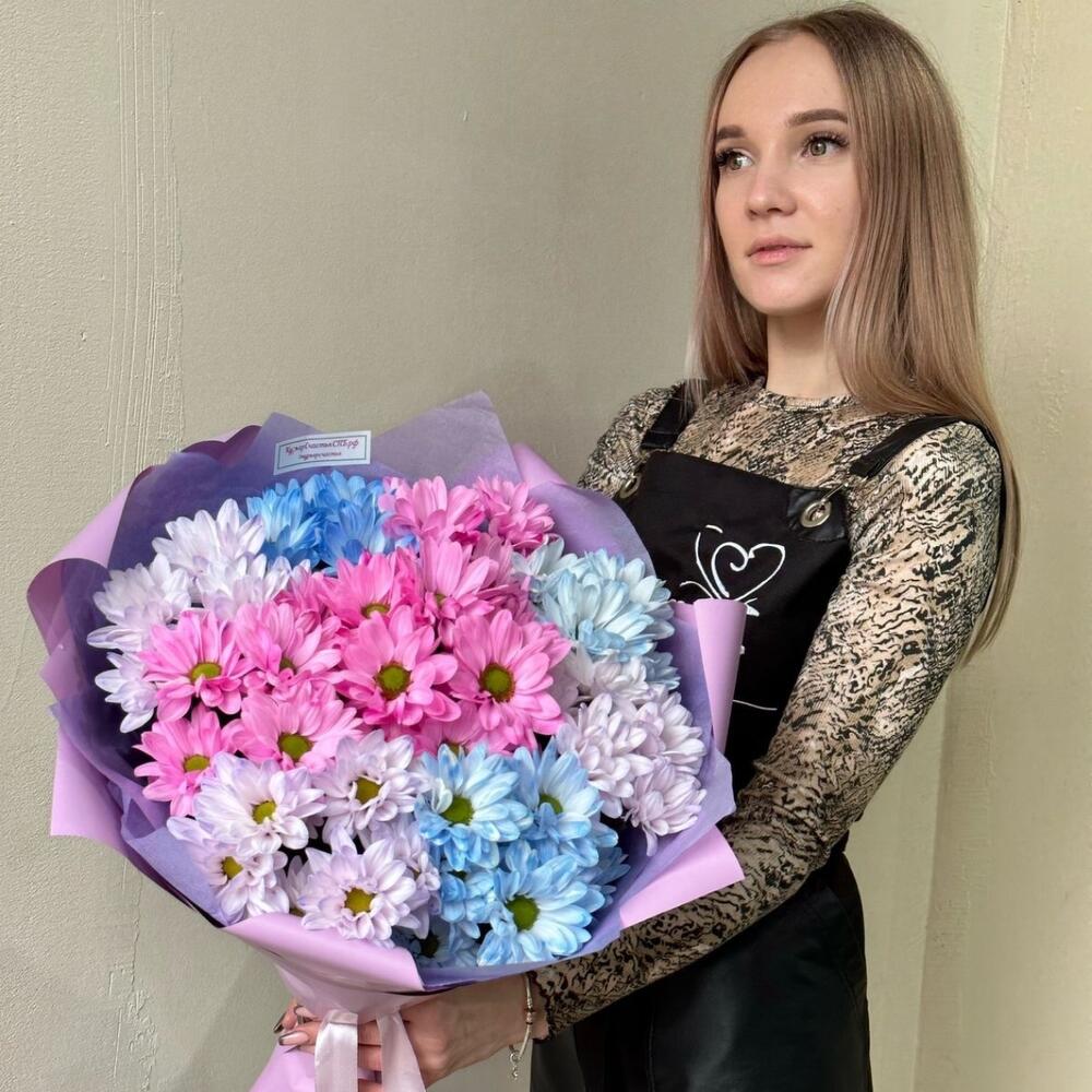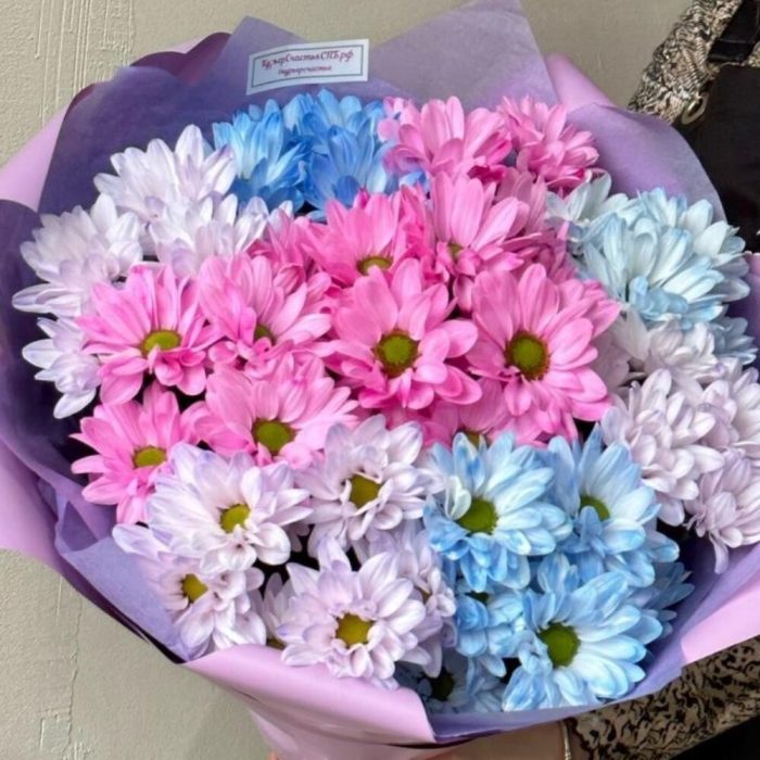 Лента атласная – 1 шт.Хризантема кустовая крашенная – 7 шт.пленка lux – 1 шт.