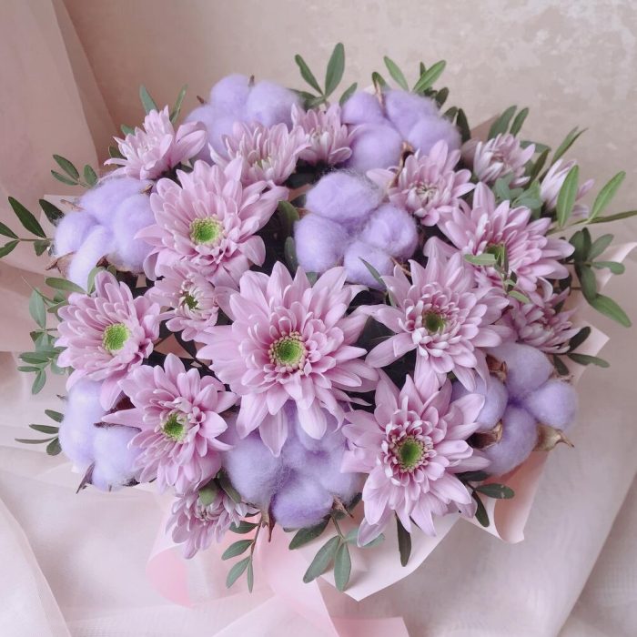 Хлопок – 7 шт.Хризантема кустовая – 3 шт.Коробка шляпная – 1 шт.листья фисташки – 1 шт.инструкция по уходу за цветами – 1 шт.любовь флориста – 1 шт.