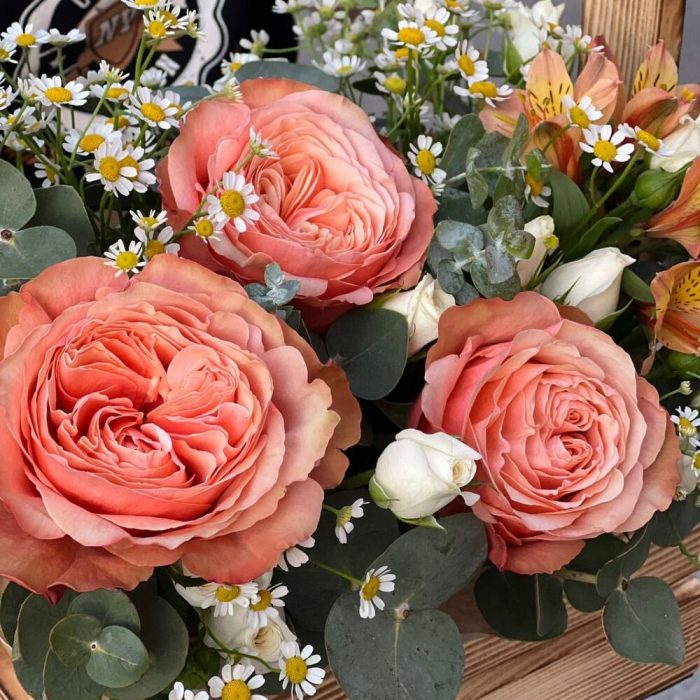 Альстромерии, Гвоздики, Кустовые розы, Лизиантусы, Розы, Хризантемы