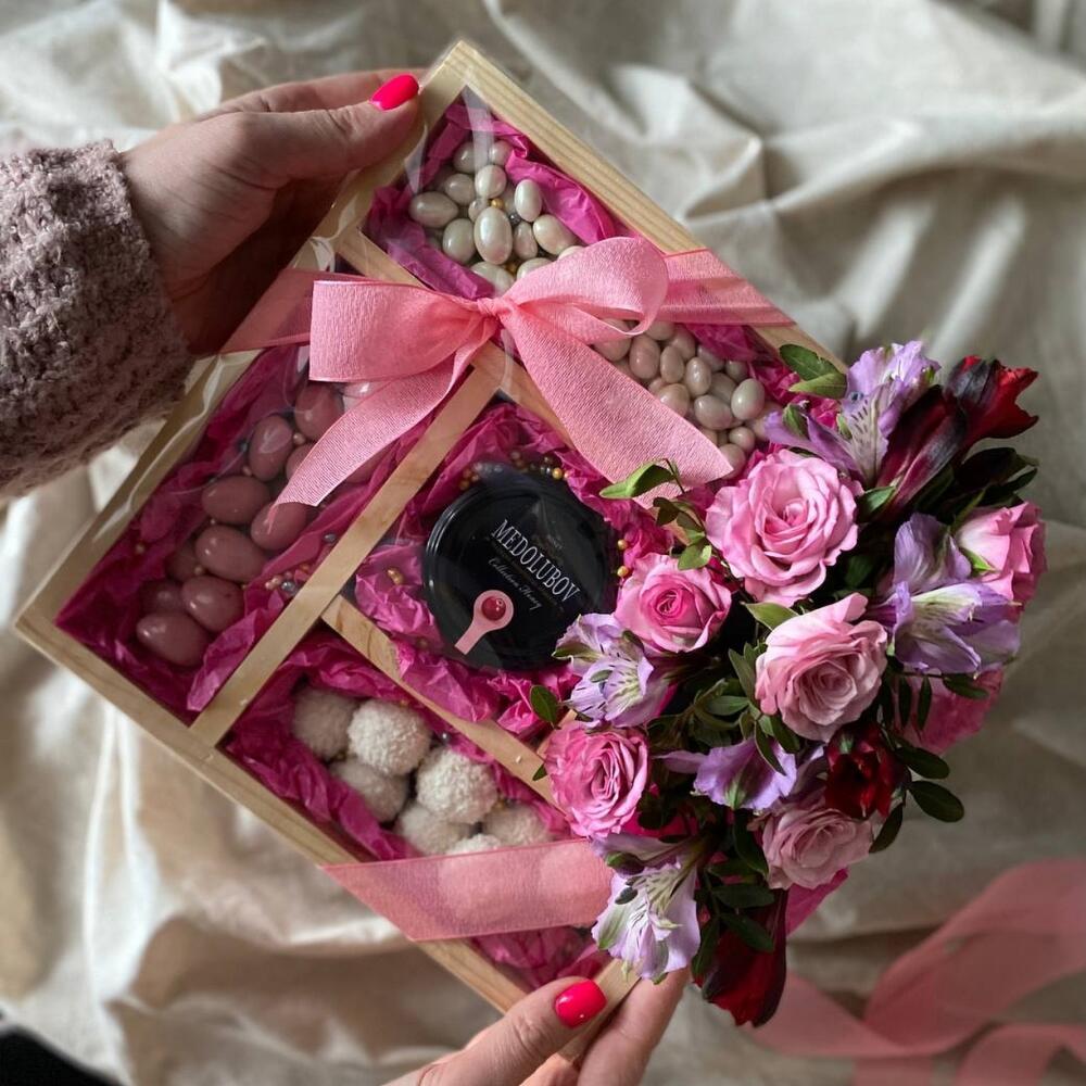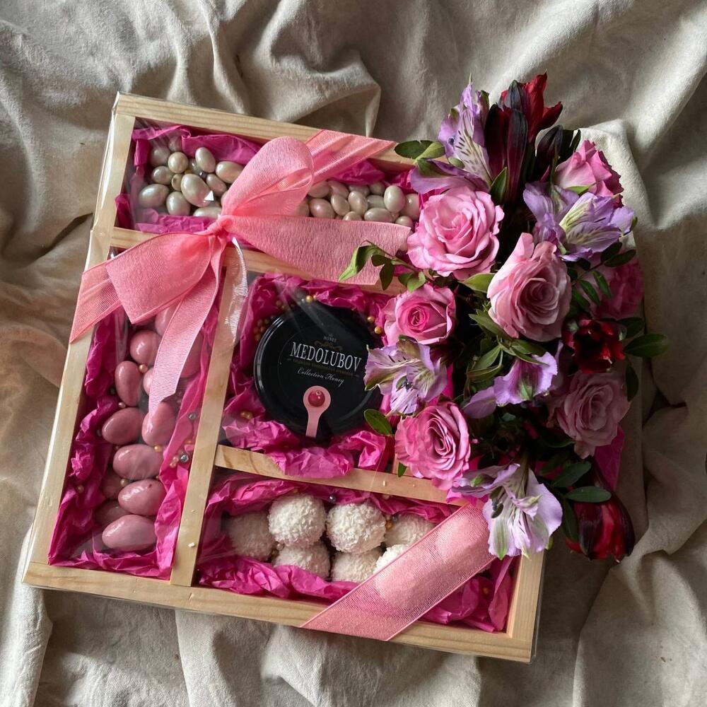 миндаль в шоколаде – 200 гр.арахис в шоколаде – 230 гр.Раффаэлло – 9 шт.Крем мед – 1 шт.Роза кустовая – 3 шт.Альстромерия – 3 шт.зелень фисташки – 1 шт.Подарочная коробка – 1 шт.