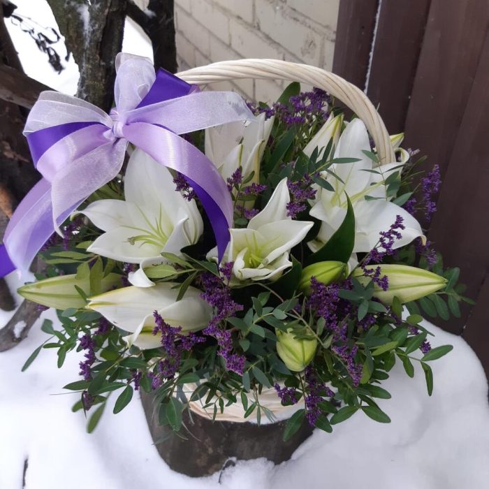 Корзина с лилиями и зеленью