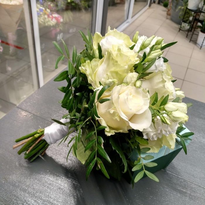 Букет невесты из белых роз и лизиантуса