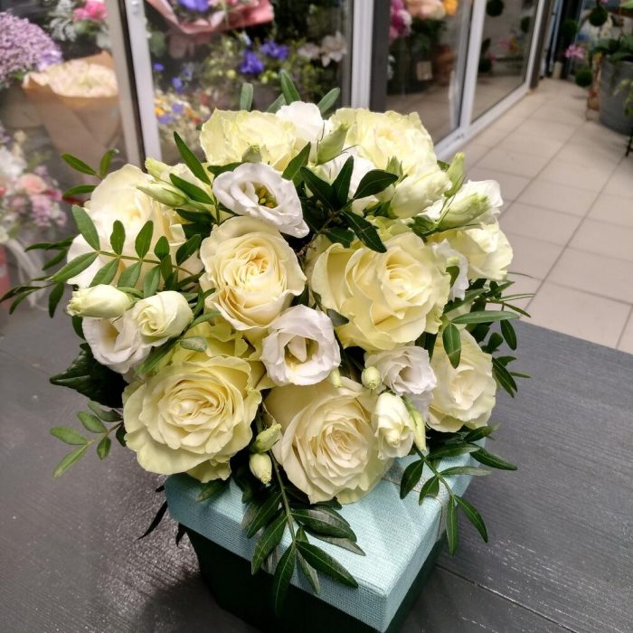 розы мондиаль – 9 шт.Лизиантус белый – 3 шт.Фисташка – 3 шт.Лента атласная – 1 шт.