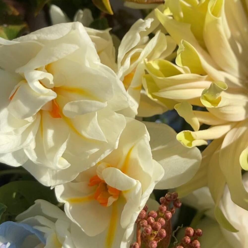 Букет с нарциссами, дельфиниумом и кудрявой герберой