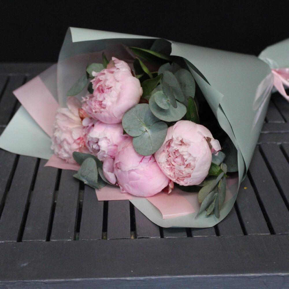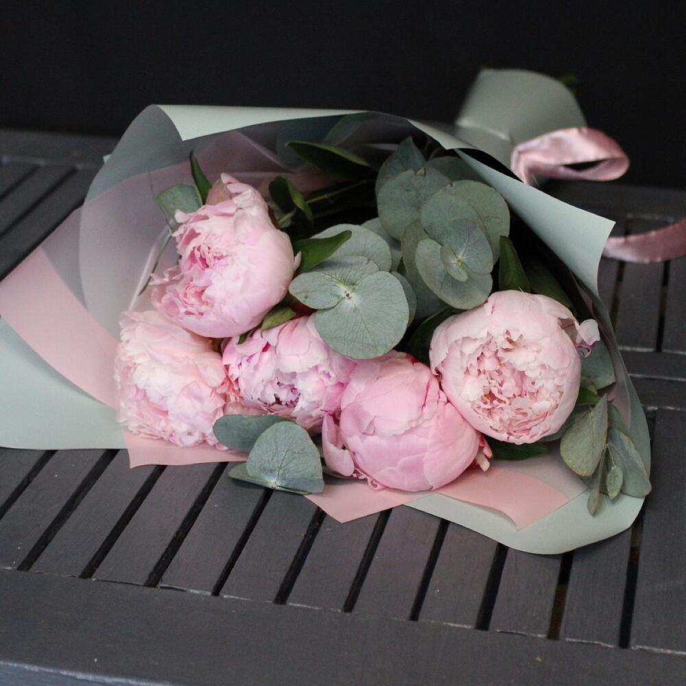 Пион Сара Бернар – 5 шт.Эвкалипт – 3 шт.Пленка матовая – 3 шт.Лента атласная – 2 шт.