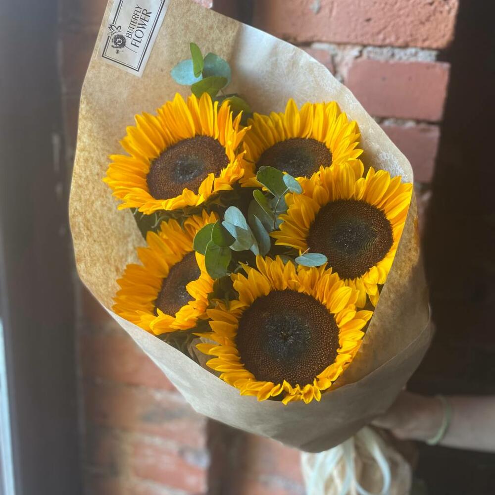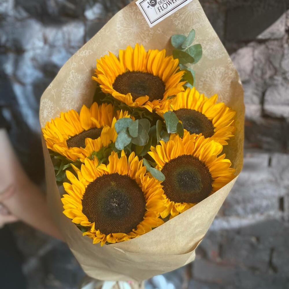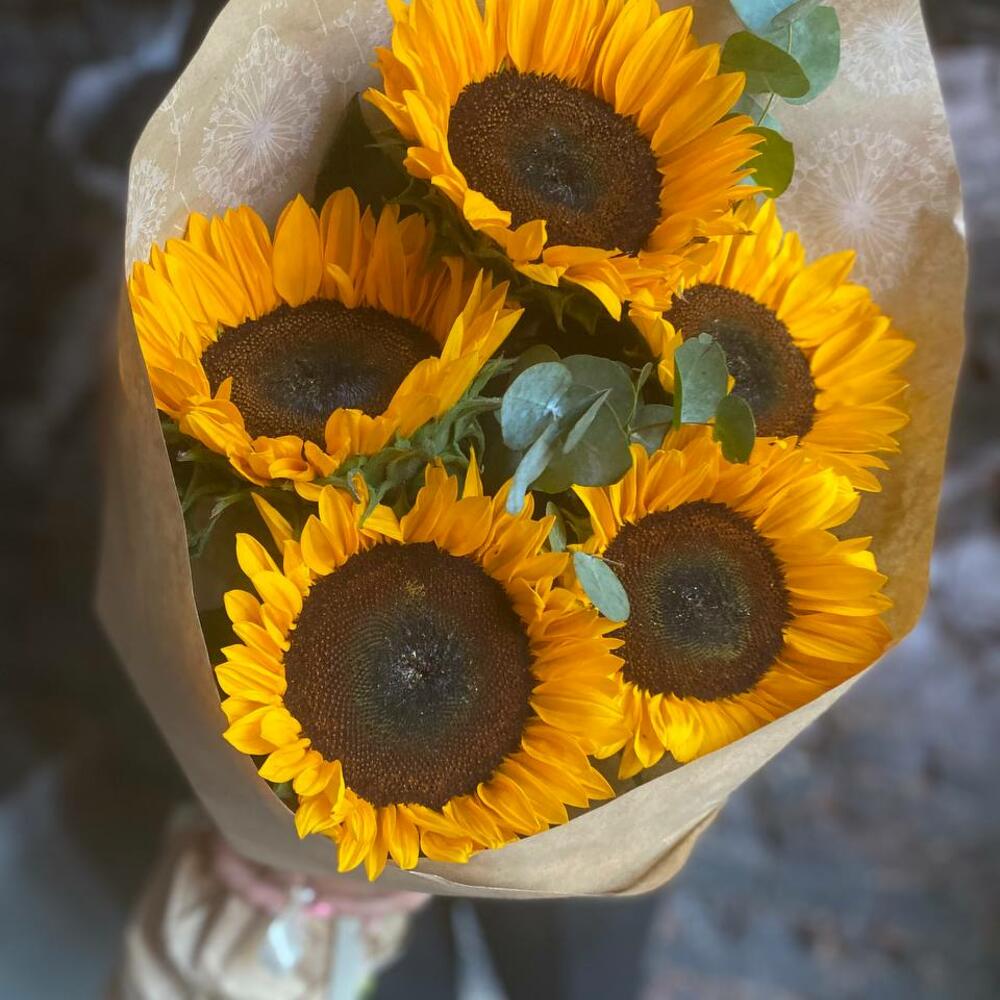 Букет из 5 подсолнухов и эвкалипта в стильной упаковке “Эбин Купер”