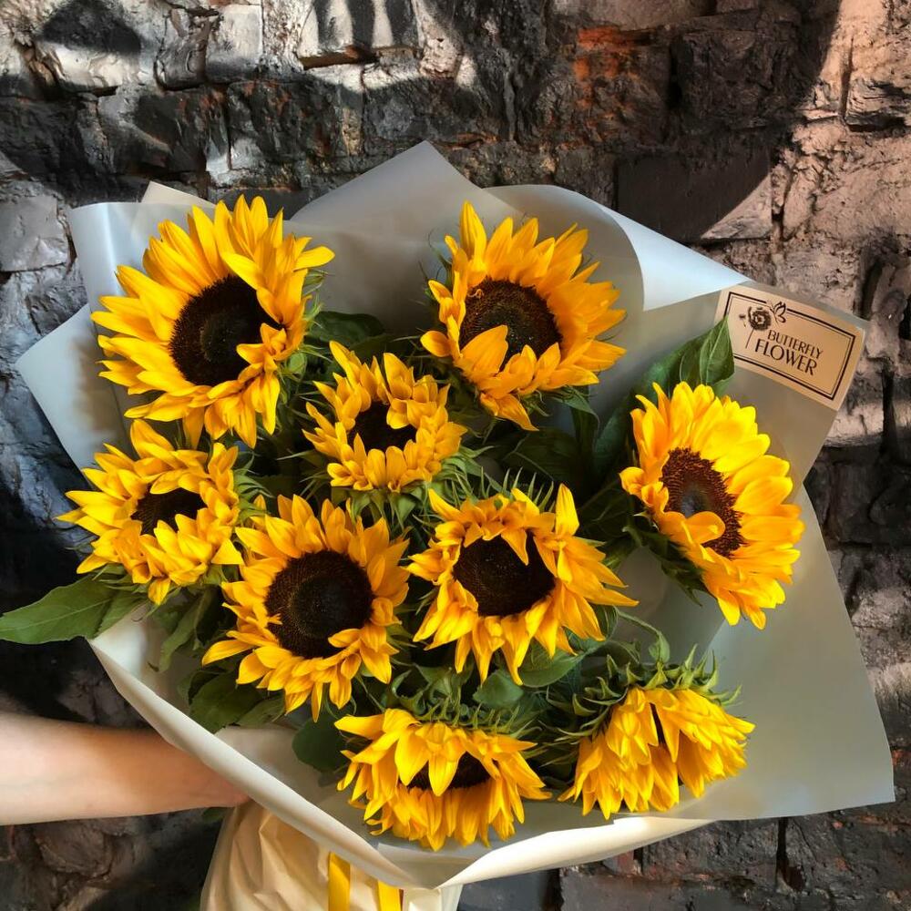 Букет из 9 подсолнухов в стильной упаковке “Прометей”
