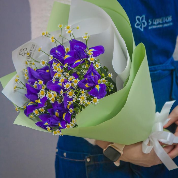 ирисы синие – 9 шт.Кустовая ромашка – 6 шт.Упаковка матовая – 1 шт.Атласная лента – 1 шт.