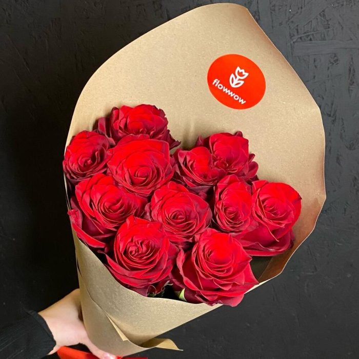 Роза эквадор 50 см – 11 шт.Крафт – 1 шт.Лента атласная – 1 шт.