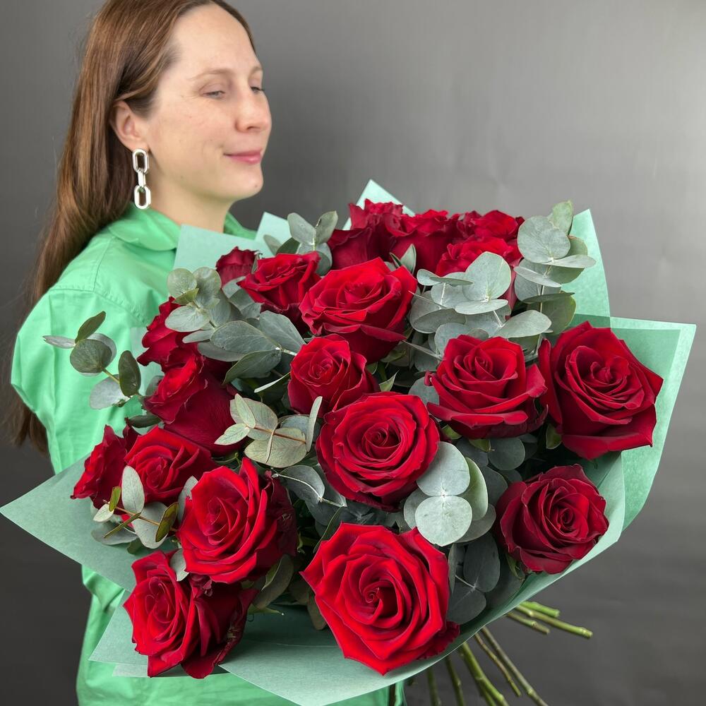 Красная роза – 21 шт.Эвкалипт – 7 шт.Дизайнерская упаковка – 1 шт.