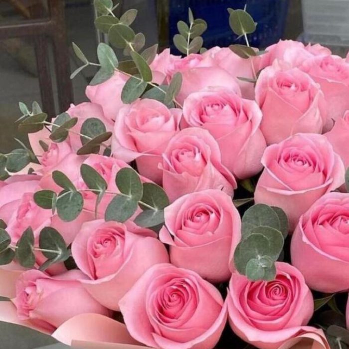 Роза розовая – 51 шт.Шляпная коробка – 1 шт.Эвкалипт – 10 шт.Открыточка с вашими пожеланиями – 1 шт.хорошее настроение – 100 шт.инструкция по уходу за цветами – 1 шт.Кризал – 1 шт.