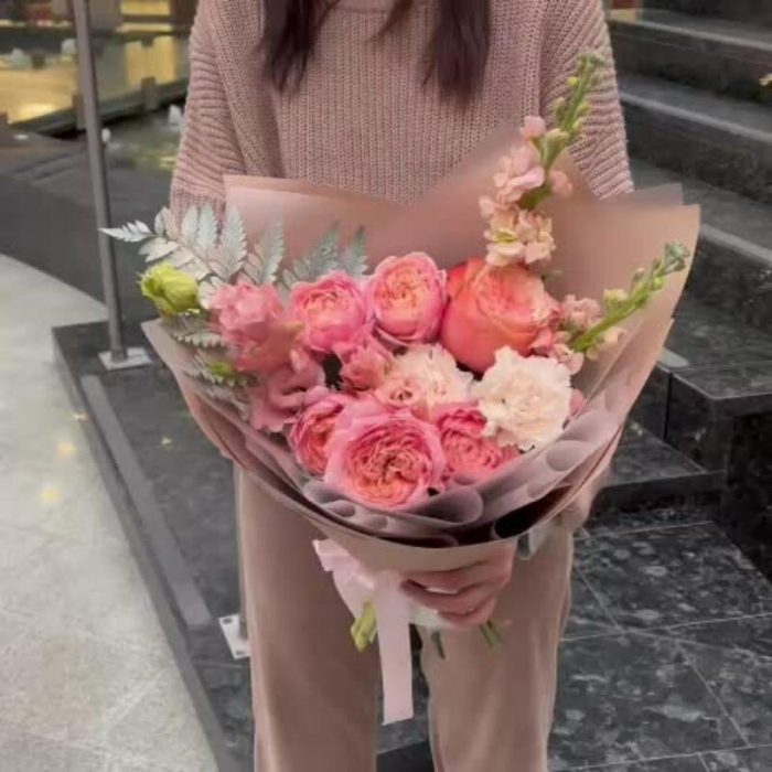 Ахматова Персиковый букет с пионовидной розой матиолой и папоротником