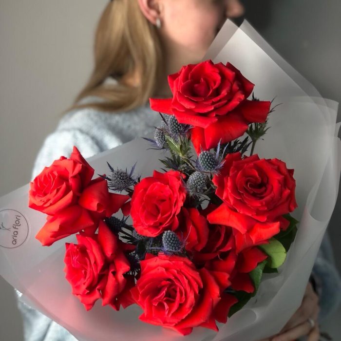 Эрингиум – 3 шт.Роза Эквадор – 7 шт.Упаковка дизайнерская – 1 шт.подкормка для срезанных цветов – 1 шт.инструкция по уходу за цветами – 1 шт.любовь флориста – 100 шт.записка с вашим текстом – 1 шт.шоколадный медиант ручной работы – 1 шт.