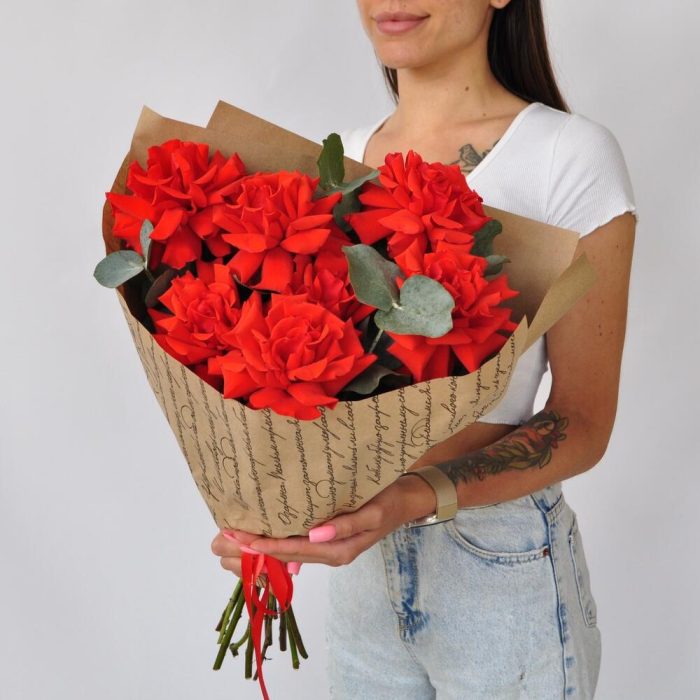 Эвкалипт – 1 шт.Лента атласная – 1 шт.Крафт – 3 шт.Роза французская – 7 шт.