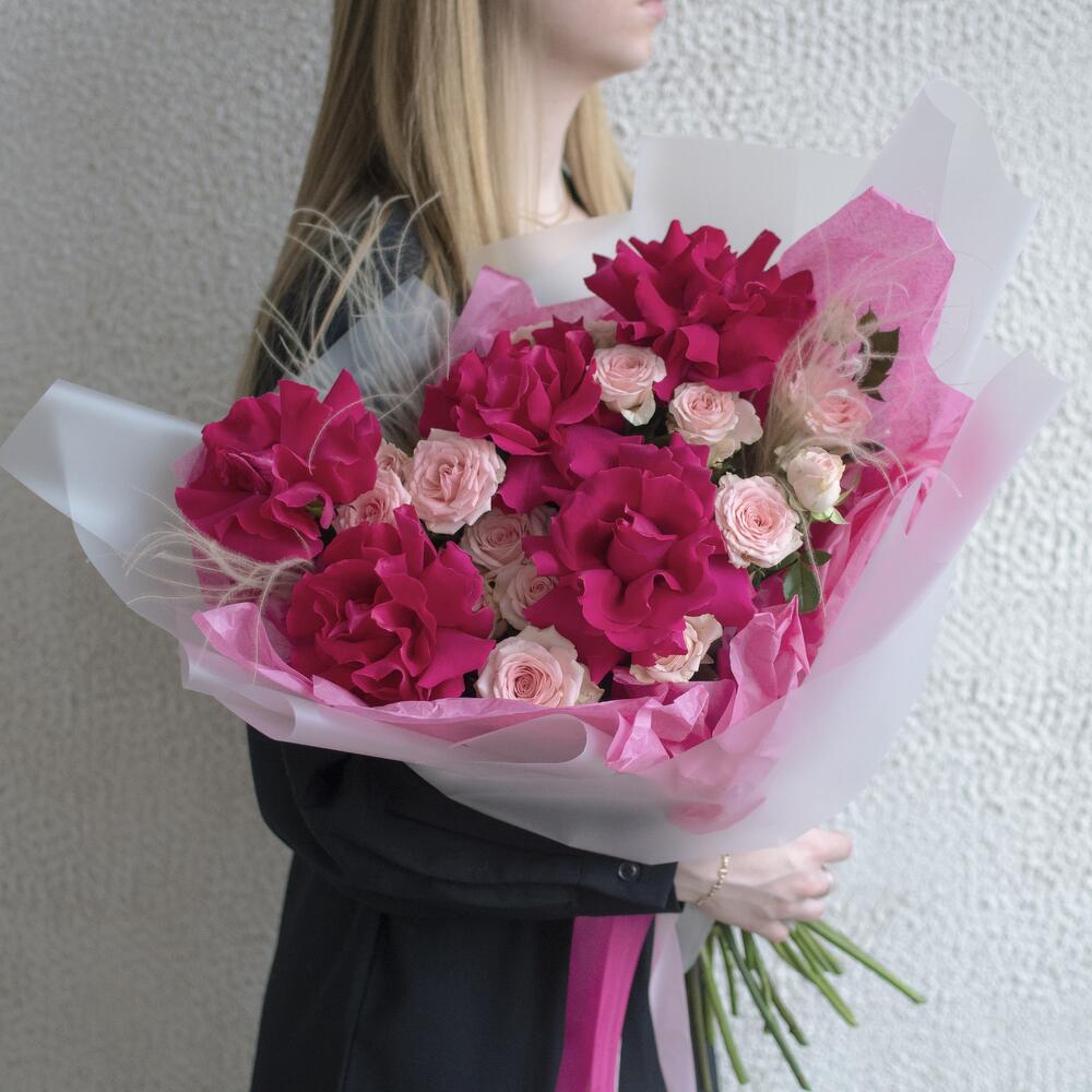 роза французская готча – 5 шт.Роза кустовая – 4 шт.пеннисетум – 2 шт.Упаковка – 1 шт.