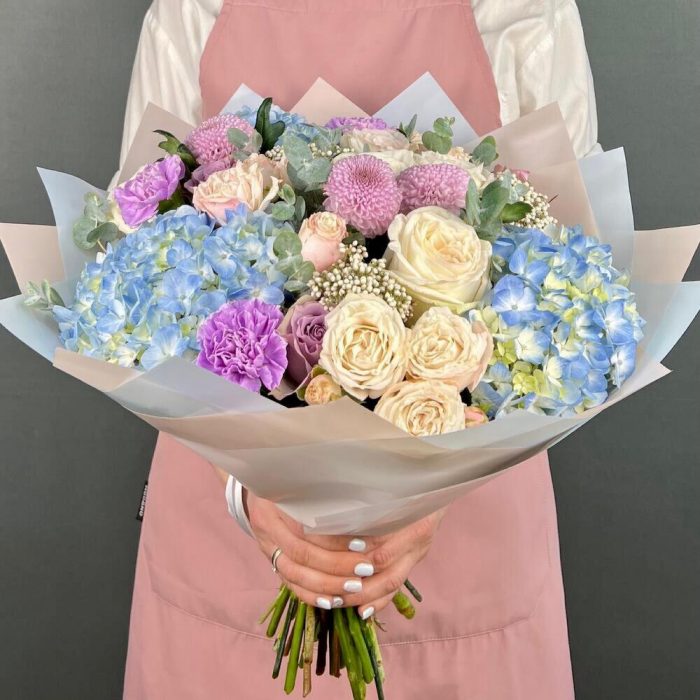 Авторский букет из голубой Гортензии, пионовидных Роз и Хризантемы Момоко