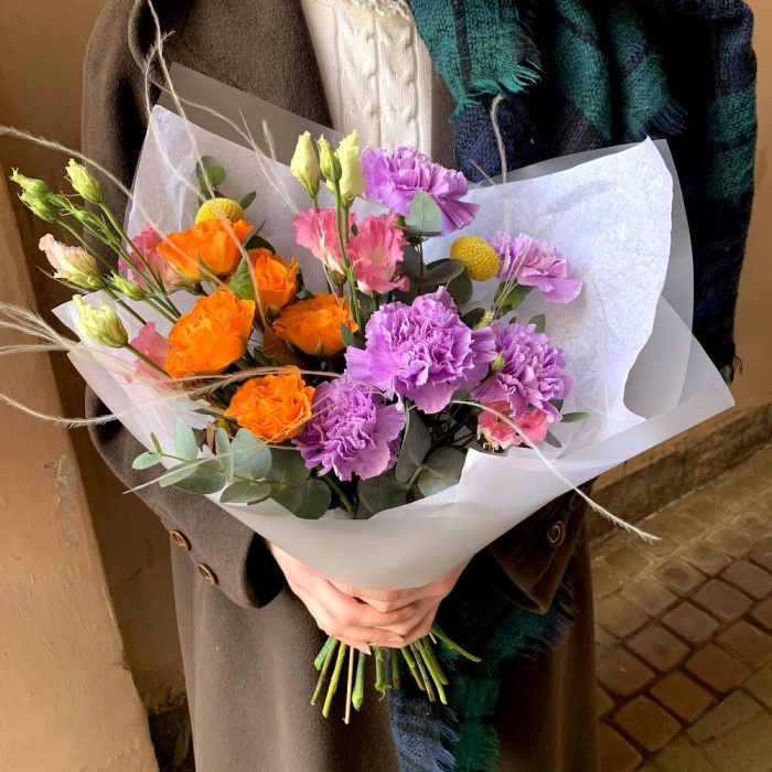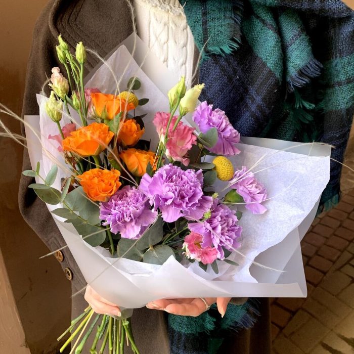 Краспедия – 2 шт.Эвкалипт – 1 шт.Гвоздика лунная – 5 шт.Лизиантус розовый – 1 шт.Стифа – 1 шт.Авторская упаковка – 1 шт.роза россия оранжевая – 5 шт.