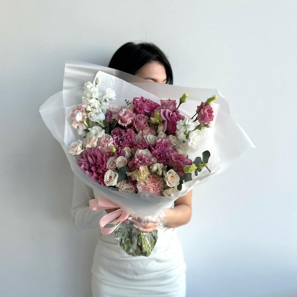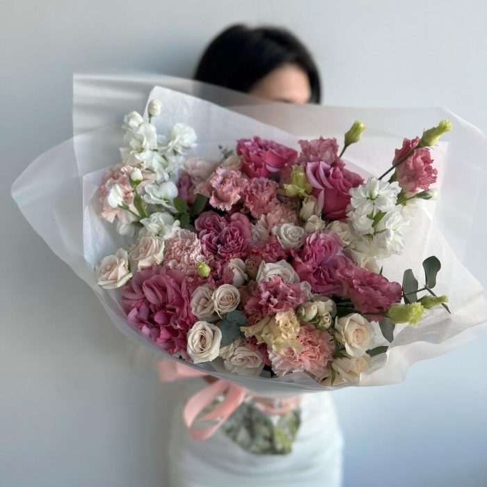 Маттиола – 3 шт.Эвкалипт – 1 шт.Кустовая роза – 7 шт.Гвоздика – 7 шт.Эустома – 2 шт.Пионовидная роза – 5 шт.