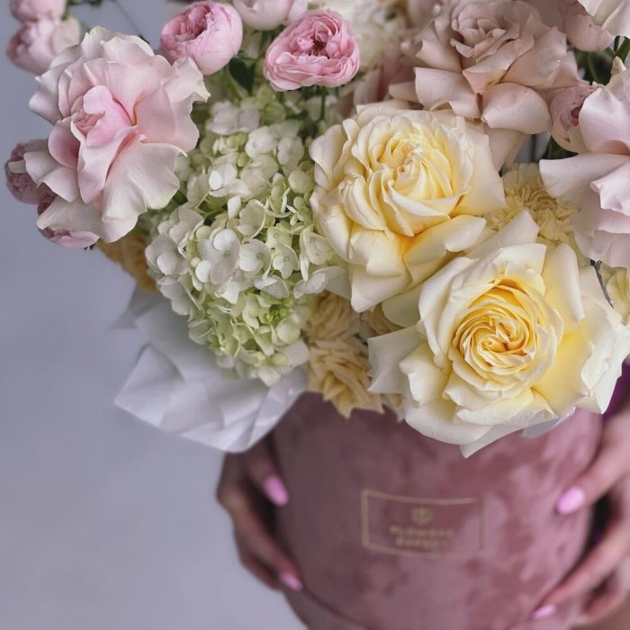 Гортензия – 2 шт.Кустовая роза – 9 шт.Гвоздика – 5 шт.Бархатная коробка – 1 шт.французские розы – 11 шт.